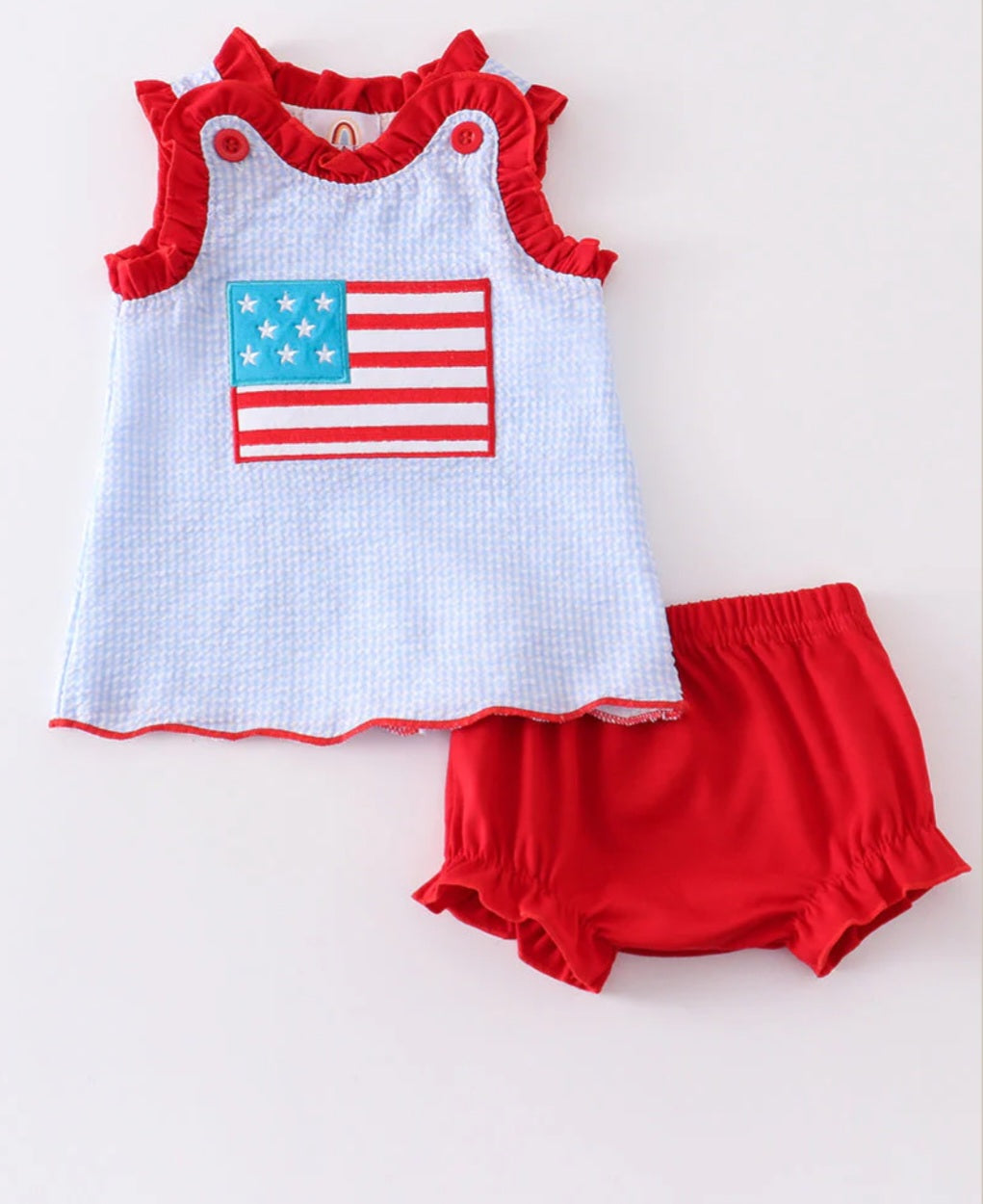 Celebrate the stars and stripes in style with our Patriotic Flag Applique Seersucker Girl Set! This adorable outfit features a bold flag design on a classic seersucker fabric. Perfect for any patriotic occasion, your little girl will look both cute and patriotic in this fun and festive ensemble.