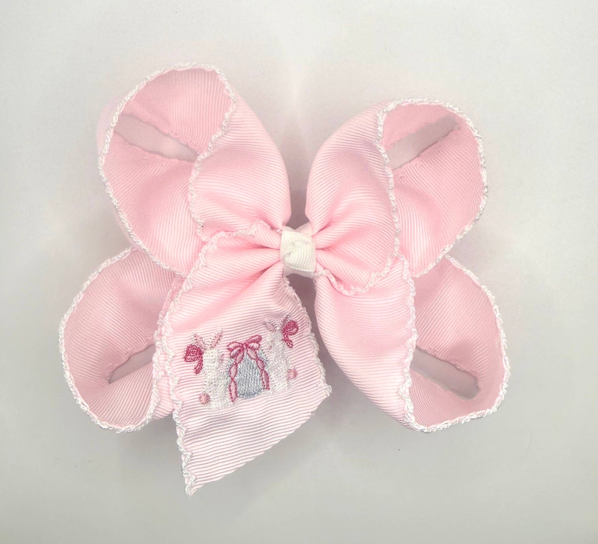 This bow is approx 5.5 inches with an alligator clip. This bow is a great addition to any Easter outfit. This bow features an Easter egg design with two adorable bunnies.