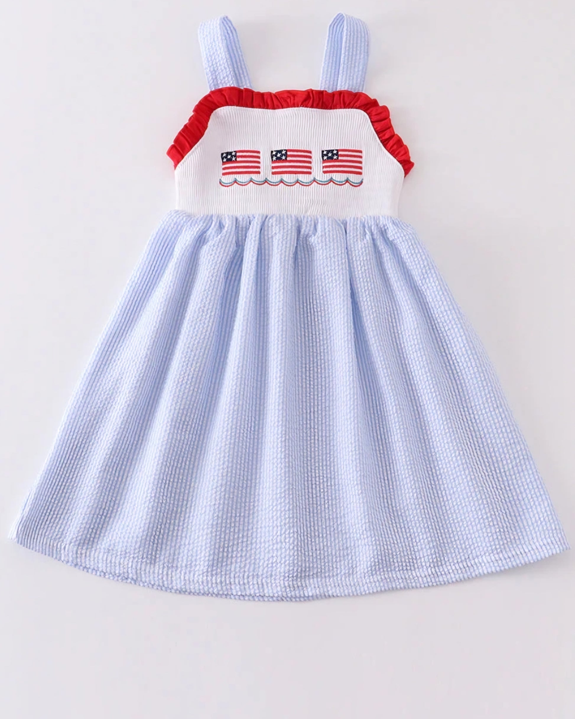 Girls Patriotic Embroidered Flag Seersucker Dress