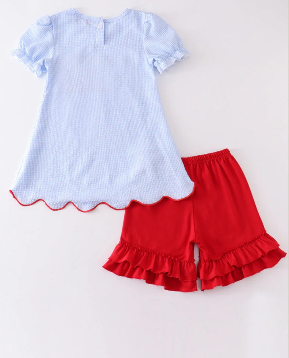 Get your little girl ready for Independence Day with this All-American set featuring a patriotic flag applique (and serious style)! Perfect for family barbecues and fireworks, she'll be the star of the show in this quirky and fun outfit. (USA! USA!)
