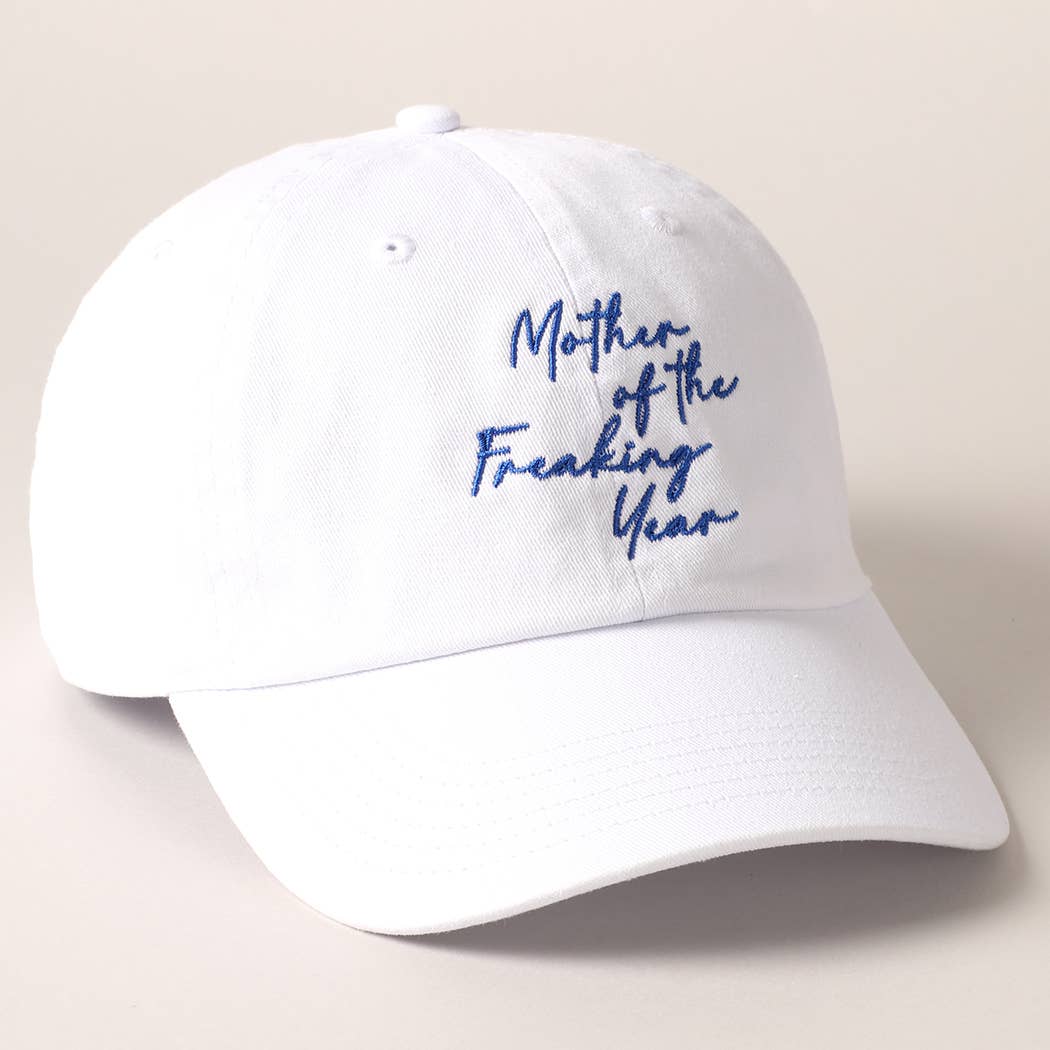 "Mother of the Freaking Year" Women's Embroidery Baseball Cap: White & Blue