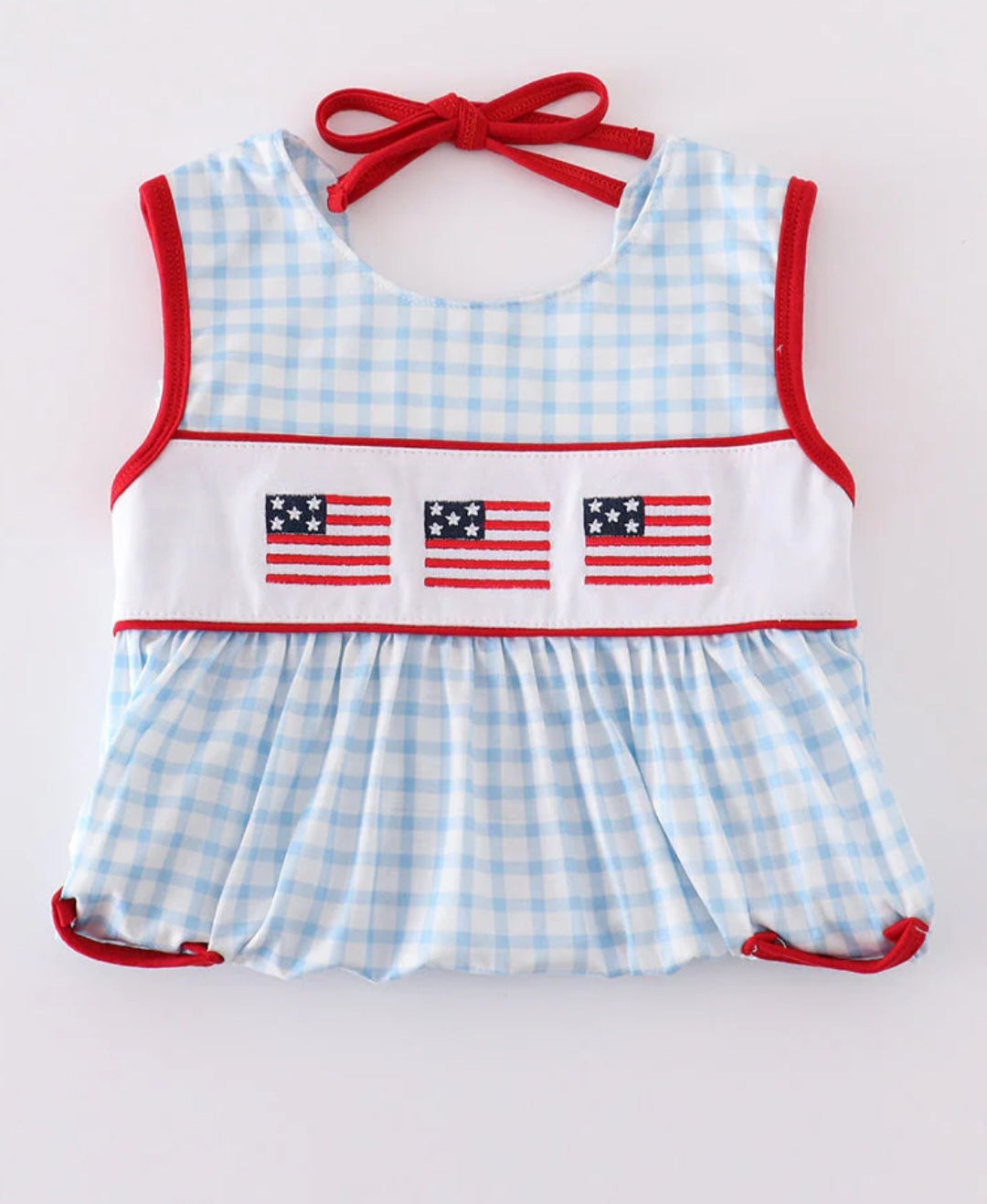 Show off your patriotic side in our Blue Flag Embroidered Dress! With its beautiful 3 flag embroidery and chic gingham pattern, this dress will make you stand out in any crowd. With two pockets and a fun tied back, its perfect for any occasion, you'll feel confident and stylish in this adorable dress.